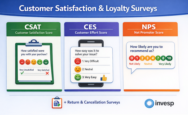 - Customer satisfaction or loyalty surveys: Use CSAT to measure customer satisfaction, CES to gauge how easy or difficult the experience was, and NPS to gauge how likely customers are to recommend you, along with return or cancellation surveys, to identify problems that hurt repeat purchases and retention.