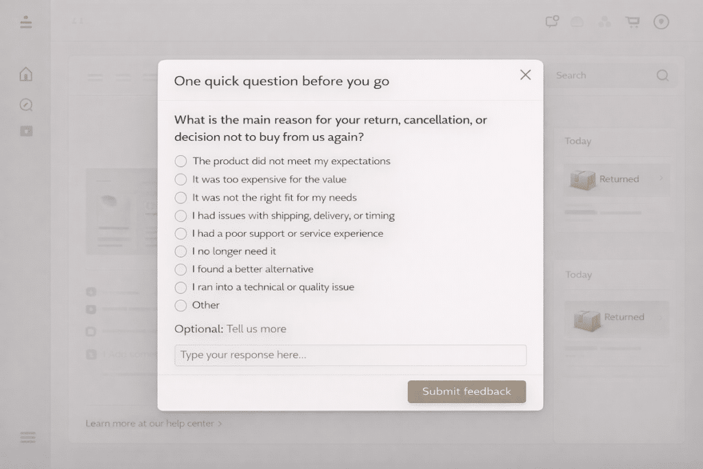 For most brands, the best starting question is: What is the main reason for your return, cancellation, or decision not to buy from us again?