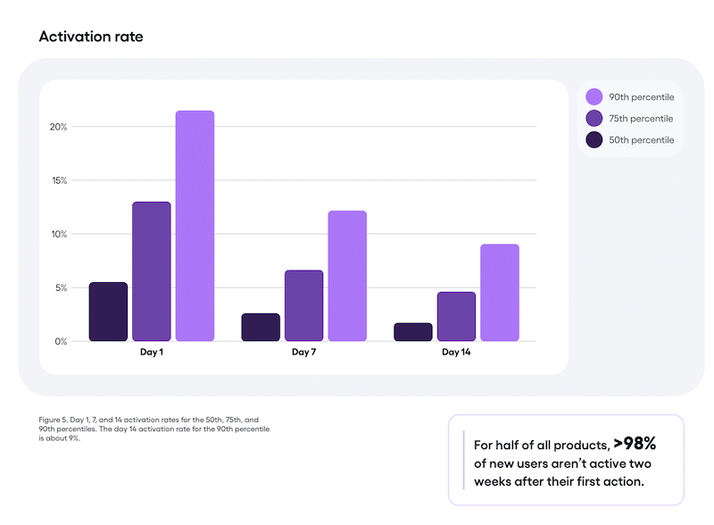 Bar chart showing product activation rates on day 1, day 7, and day 14 across the 50th, 75th, and 90th percentiles, with much lower activity by day 14 (Source)